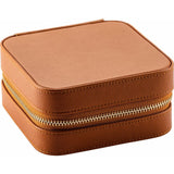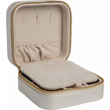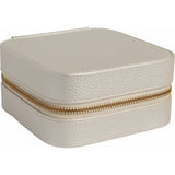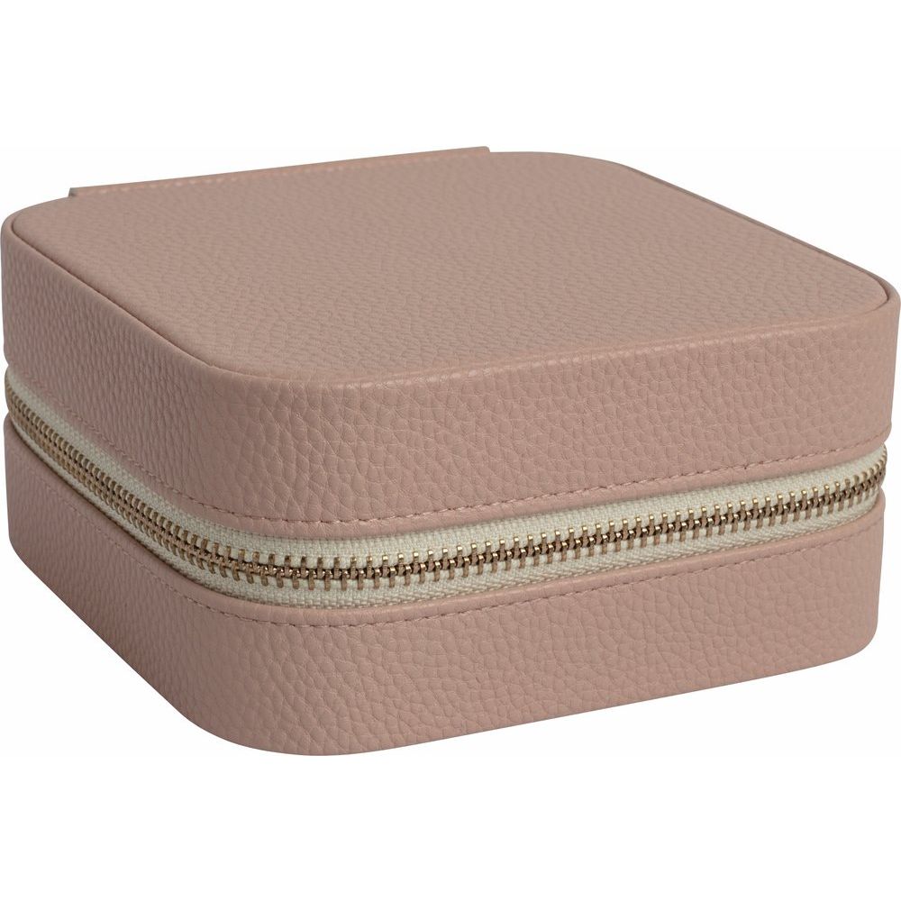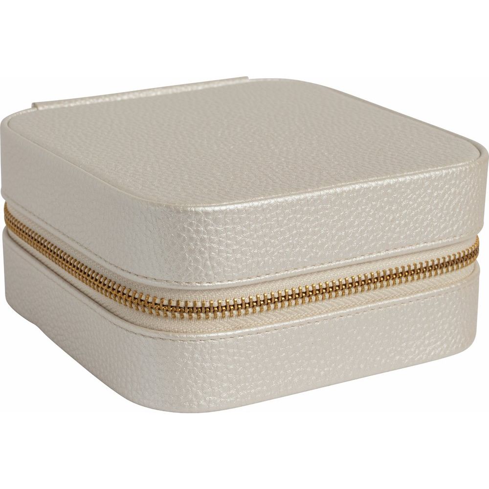 Leatherette travel case with mirror divider, three tabs and pouch for excess chain/necklace holder, ring slots, and four open compartment holders. Available in champagne & blush.